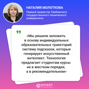 Наталия Молоткова поделилась опытом использования новых технологий: «Мы решили заложить в основу индивидуальных образовательных траекторий систему подсказок, которые генерирует искусственный интеллект. Технология предлагает студентам курсы не в жестком порядке, а в рекомендательном».