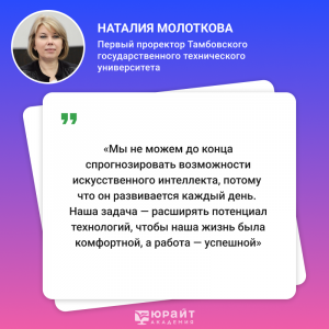 На минувшей неделе в Юрайт.Академии состоялась онлайн-дискуссия «Студенческие практики работы с ИИ-приложениями». Своим опытом поделилась первый проректор Тамбовского государственного технического университета, профессор, доктор педагогических наук Наталия Молоткова.