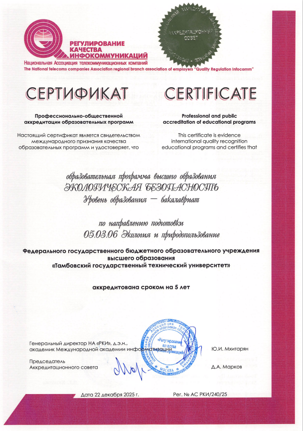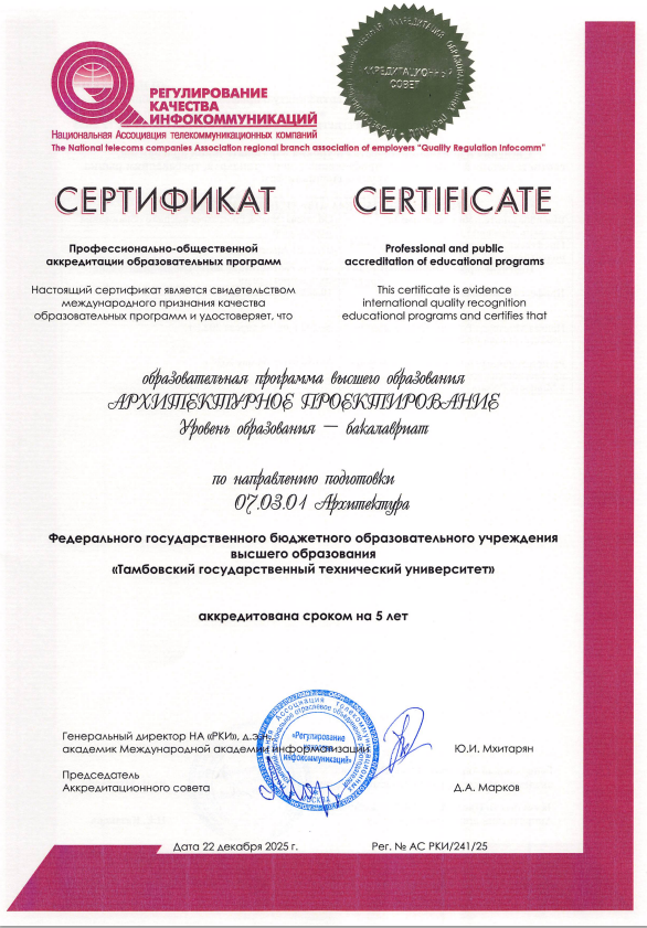 Тамбовский государственный технический технический университет успешно завершил очередную процедуру профессионально-общественной аккредитации. Получены сертификаты на программы бакалавриата «Экология и природопользование» (05.03.06) и «Архитектура» (07.03.01).